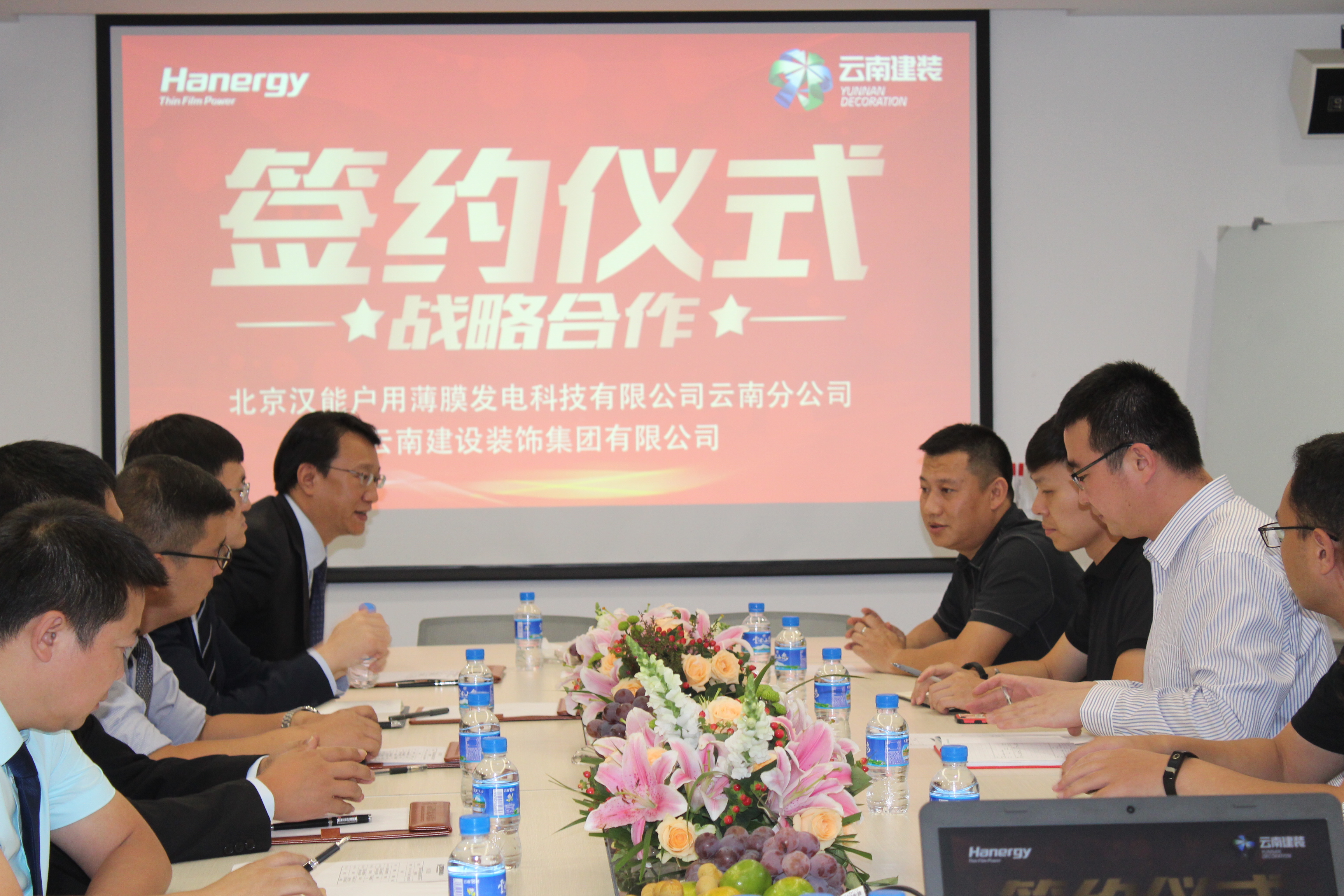 2019年8月7日,云南建裝與北京漢能戶用薄膜發電科技有限公司云南分公司在云南建設裝飾集團有限公司簽署戰略協議。漢能集團云南公司與云南建設裝飾集團有限公司將在“綠色生態智慧城市、綠色生態智慧園區、發電綠色建筑”等領域開展全面戰略合作。